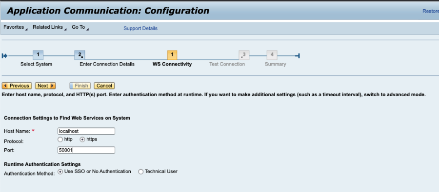 Enter the Host Name of the system, the SSL Port, choose https for the Protocol and make sure Use SSO is selected for the Authentication Method and click Next