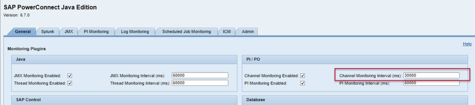 Stay in the General tab, and modify the desired data extraction interval. In this example, we are changing the Channel Monitoring Interval from 60,000 milliseconds to 30,000 milliseconds. Save the configuration at the bottom of the screen.