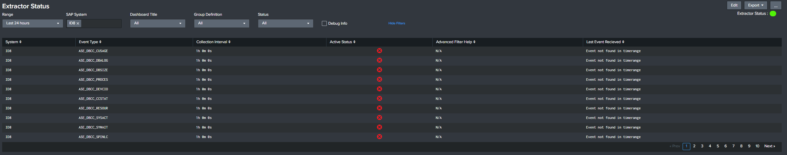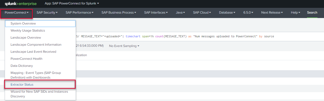The first step in this case is to check with the SAP team to review the Group Definition configuration in the system where you cannot see the data to confirm it is active. Please review the section above titled “Data for Particular Extractor is Not Visible in Splunk” in the “Procedures - ABAP System” section. If for some reason, you do not have access to the SAP system, please access the Extractor Status dashboard, made available during the Splunkbase App 6.2 release. This dashboard can be accessed by going to the PowerConnect App in your Splunk instance. Then select PowerConnect → Extractor Status.