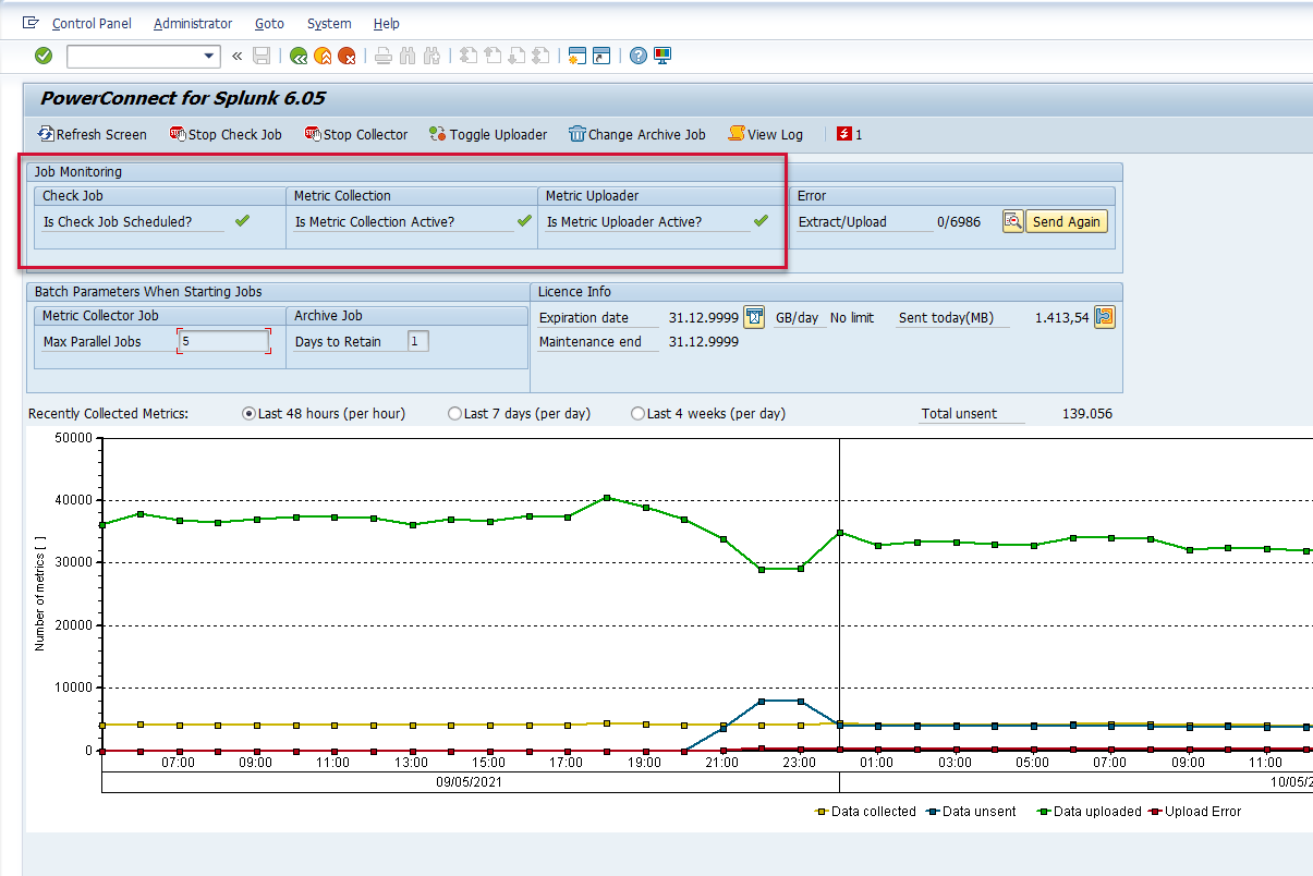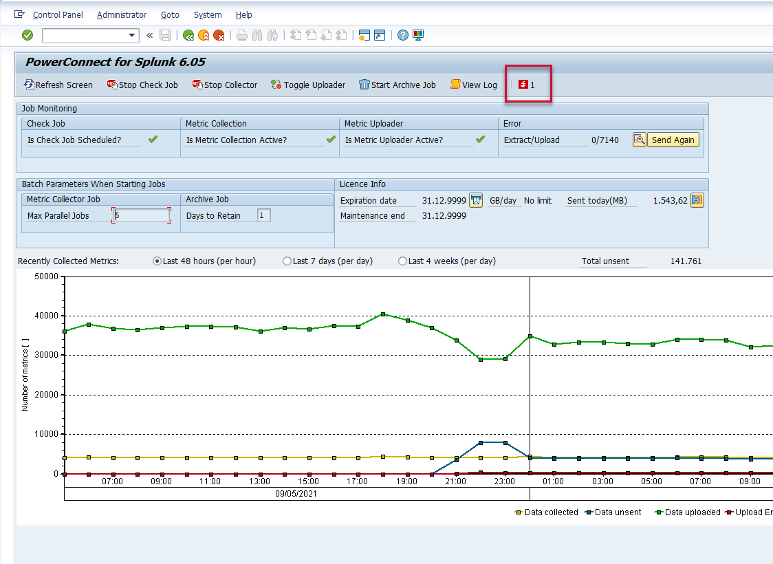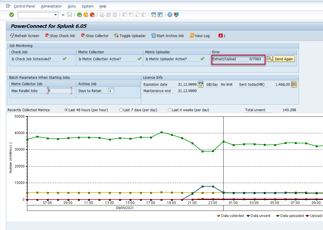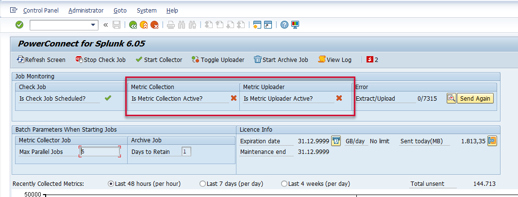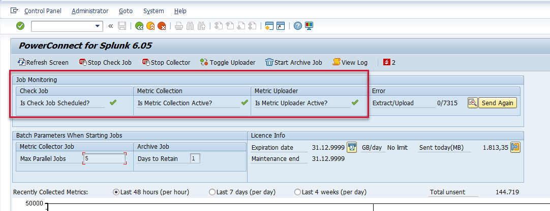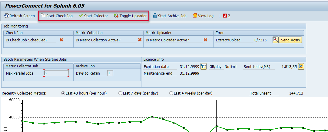 If there is no data being sent to Splunk, the first item to check is to determine if PowerConnect batch jobs are disabled. To determine this, log into the managed system, and execute the /n/bnwvs/main transaction. Then confirm that all three jobs have a green check box next to their name.