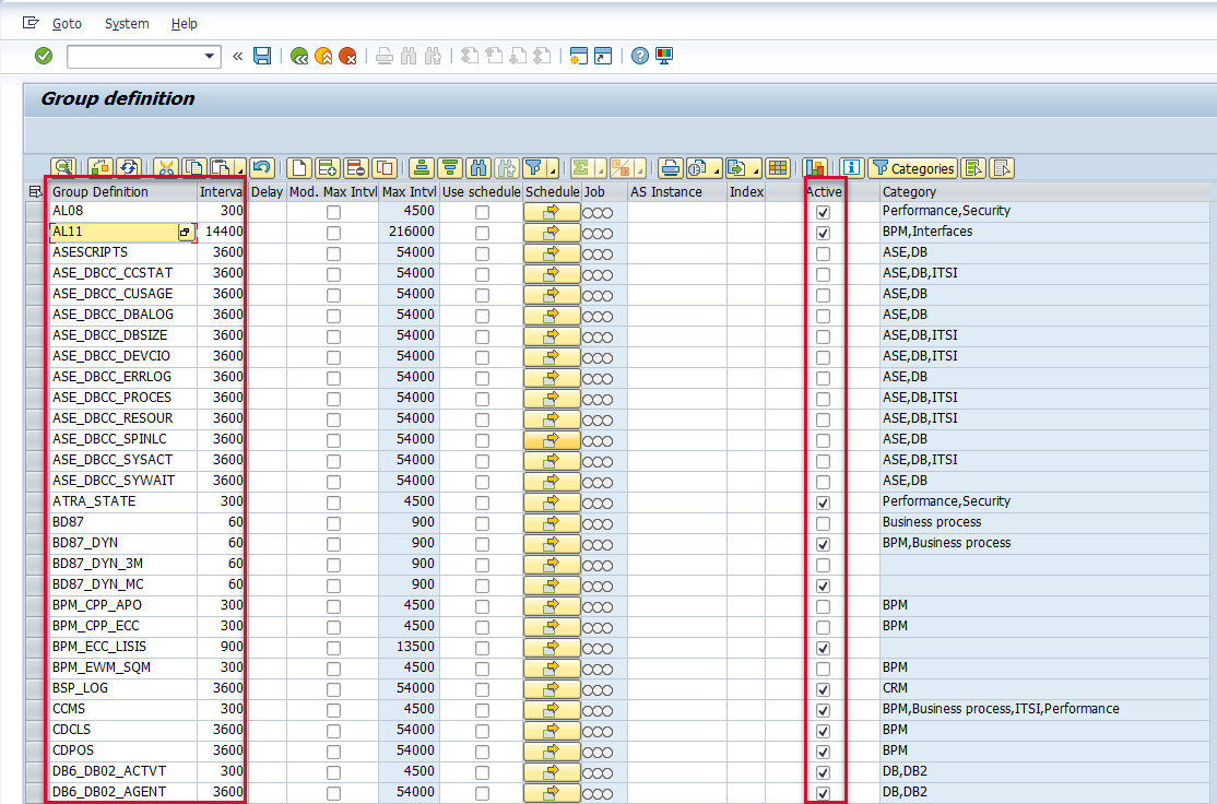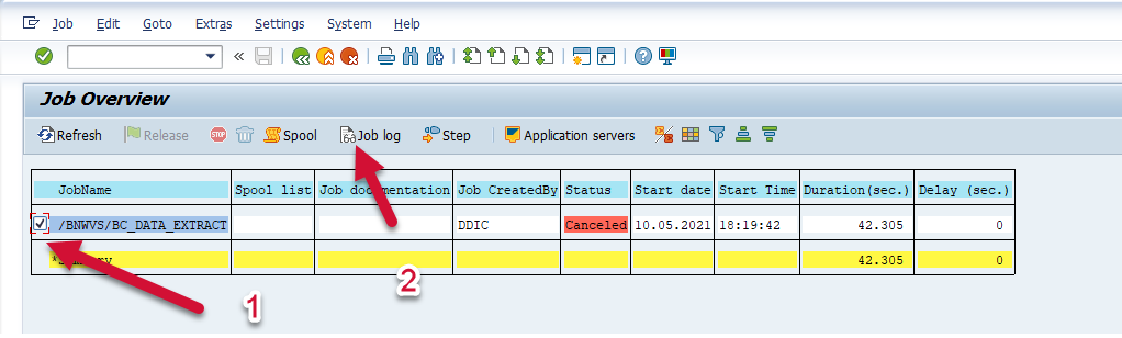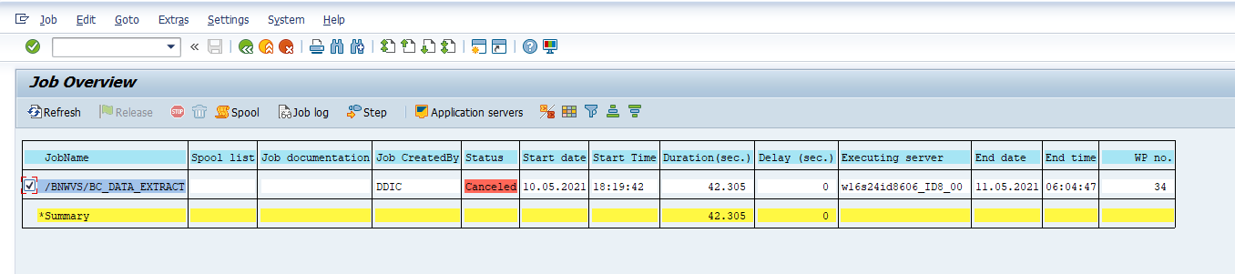 The first step is to review the Group Definition configuration in the system where you cannot see the data to confirm it is active. Complete these steps by logging into the managed system in SAP, and executing the /n/bnwvs/main transaction. Confirm that the three batch jobs are activated (green check boxes). If the jobs are deactivated, reactivate them, and check in Splunk in accordance with the interval defined for the extractor (see below for how to obtain this information).
