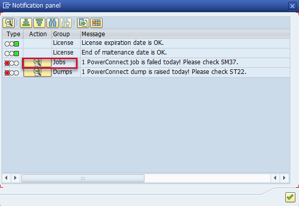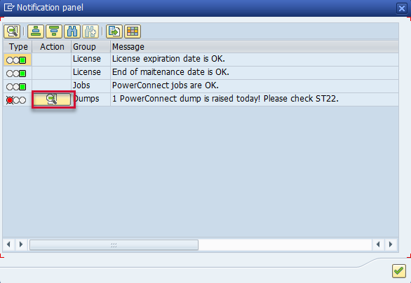 If there are dumps associated with the PowerConnect application they will be visible in the ST22 transaction. Additionally, you can view if there are PowerConnect dumps in the PowerConnect Administrative Console by logging into the managed system and executing the /n/bnwvs/main transaction. Then click on the following icon in the top right side of the screen: