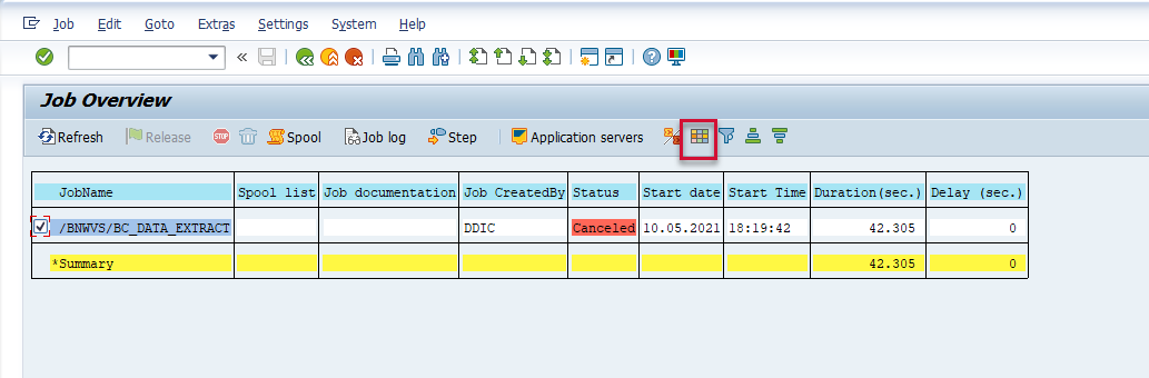 If there are batch job failures associated with the PowerConnect application they will be visible in the SM37 transaction. Additionally, you can view if there are PowerConnect batch job failures in the PowerConnect Administrative Console by logging into the managed system and executing the /n/bnwvs/main transaction. Then click on the following icon in the top right side of the screen: