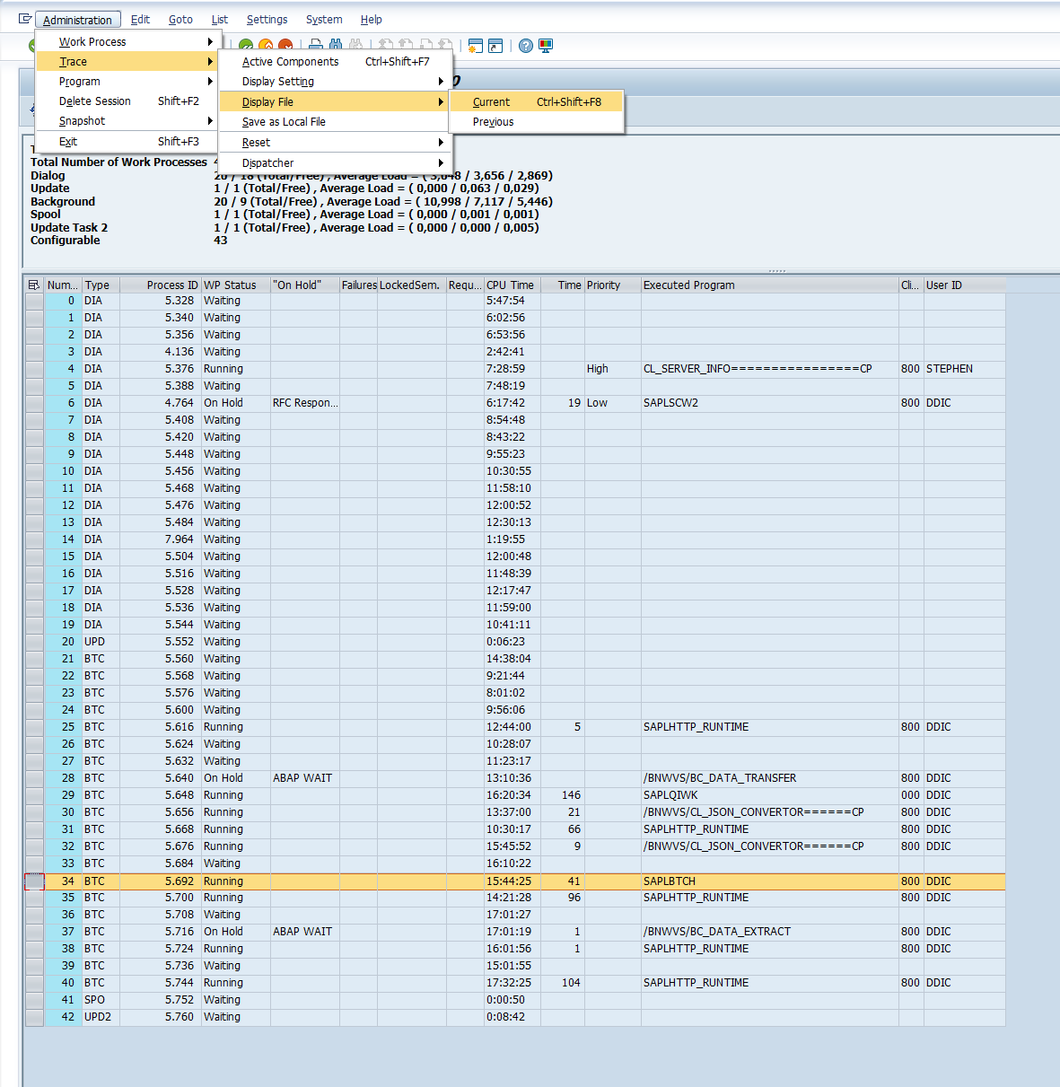 Reference the work process number noted from the SM37 data and highlight the row associated with that number. Then from the top menu go to Administration → Trace → Display File → Current