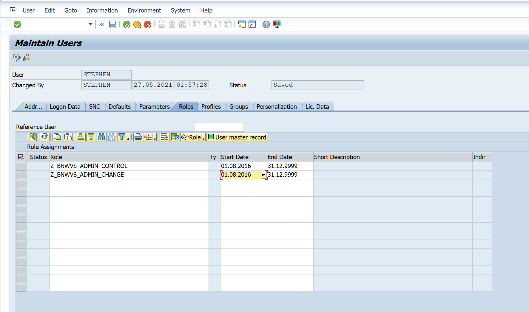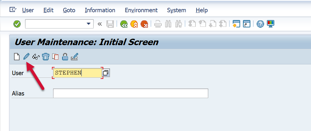 To assign the roles to each respective user, execute the SU01 transaction. Then enter the user ID, and select the change button.