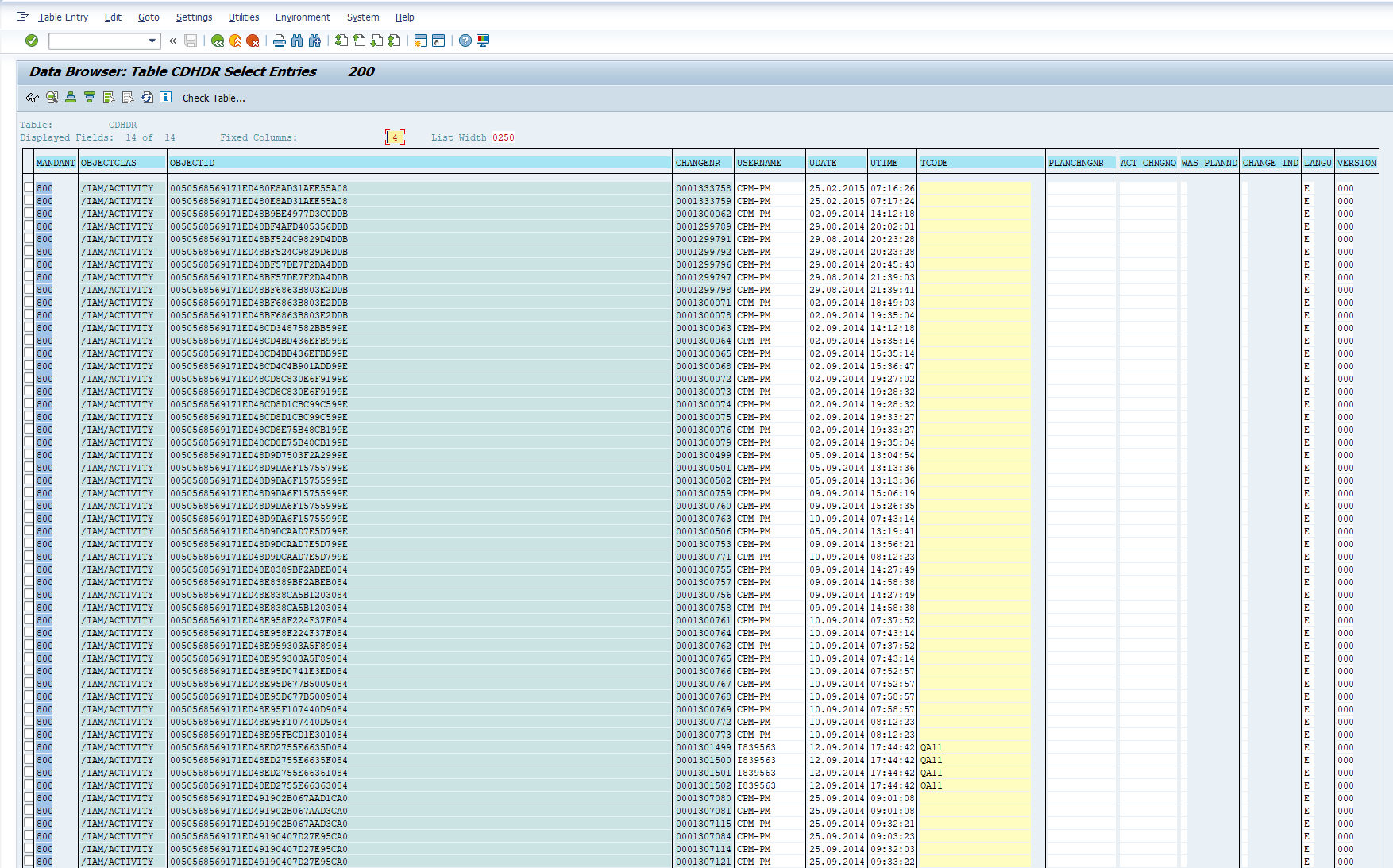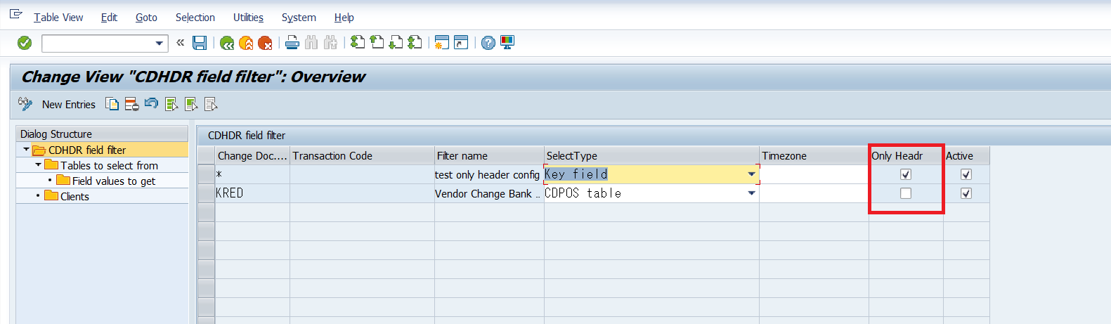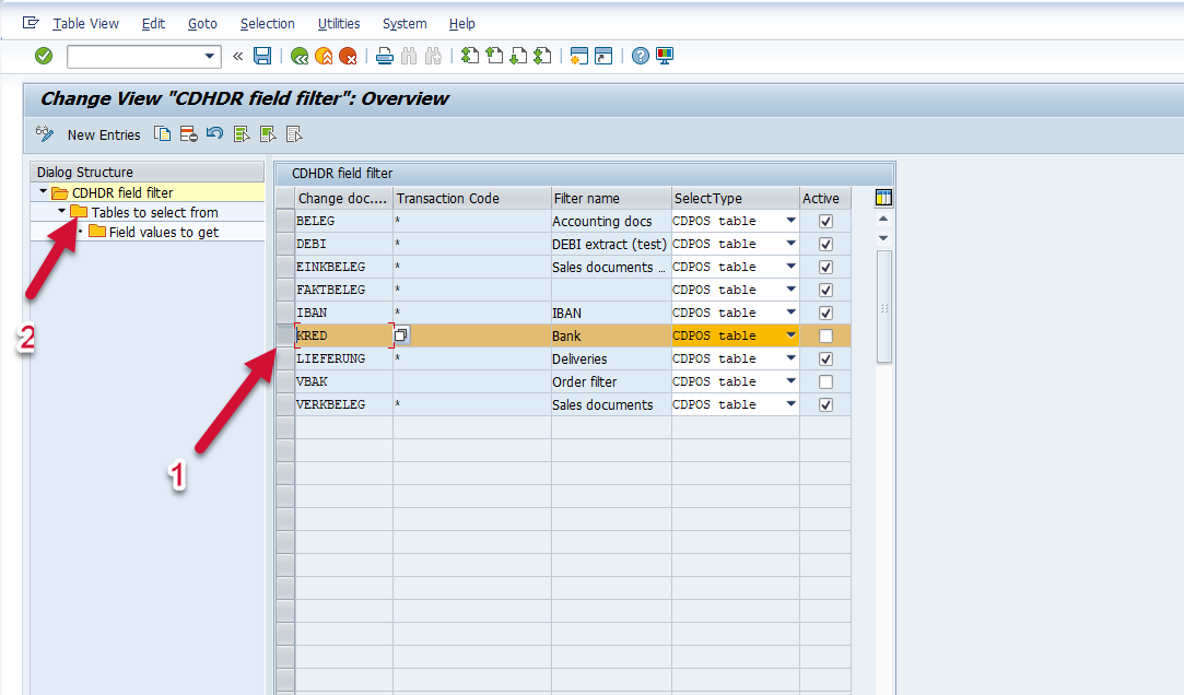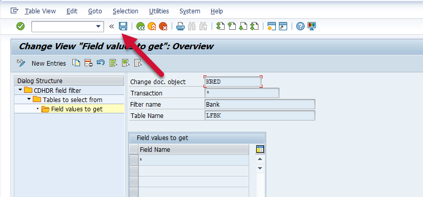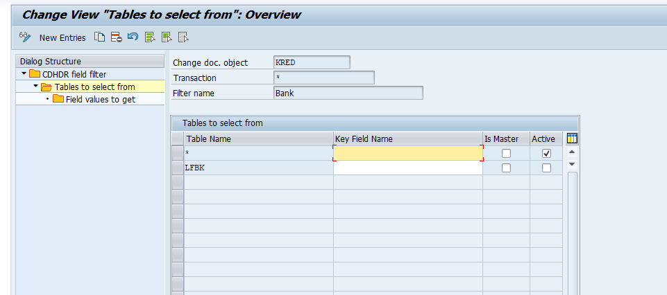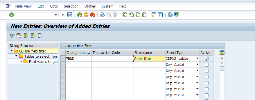 Click on the New Entries button to add additional values. Define the filter header records by indicating Change document object, Transaction code, Description (wildcards are supported). Selection type should be “CDPOS table”. Save.
