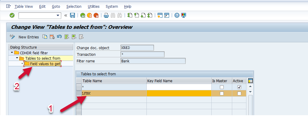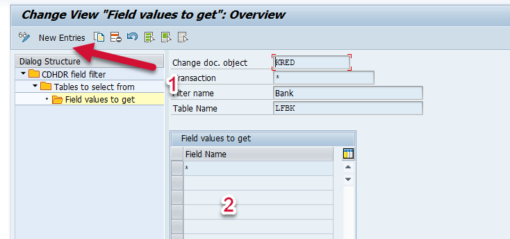 For each table it is possible to define list of fields to be extracted (wildcards are supported). Add the desired entries by selecting the New Entries button, and enter the desired parameters. Highlight the table of interest and double-click on the “Field values to get” option.