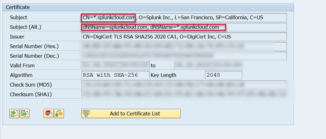 When uploading the SSL certificate into the SAP system via STRUSTSSO2, please confirm the CN field matches the root domain of your Splunk instance. See the example below for Splunk Cloud.