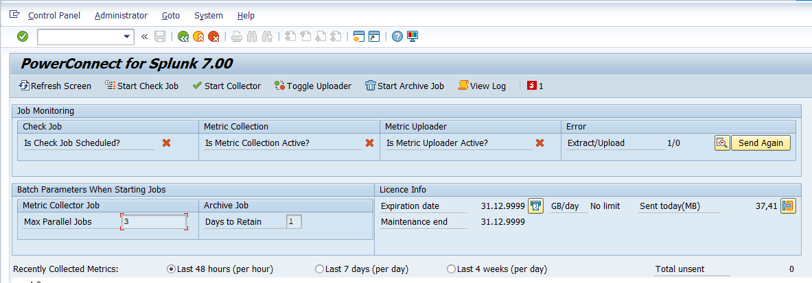 Basic configuration is finished. The batch jobs should begin automatically, collecting data and sending it to Splunk using the configured connection.