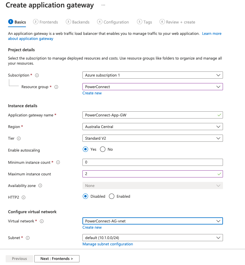 Fill out the details including the Application gateway name and min and max instance count. Either choose and existing Virtual network for the application gateway to reside or create a new one:
