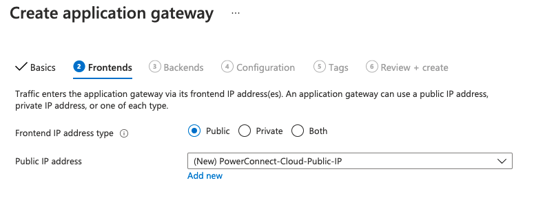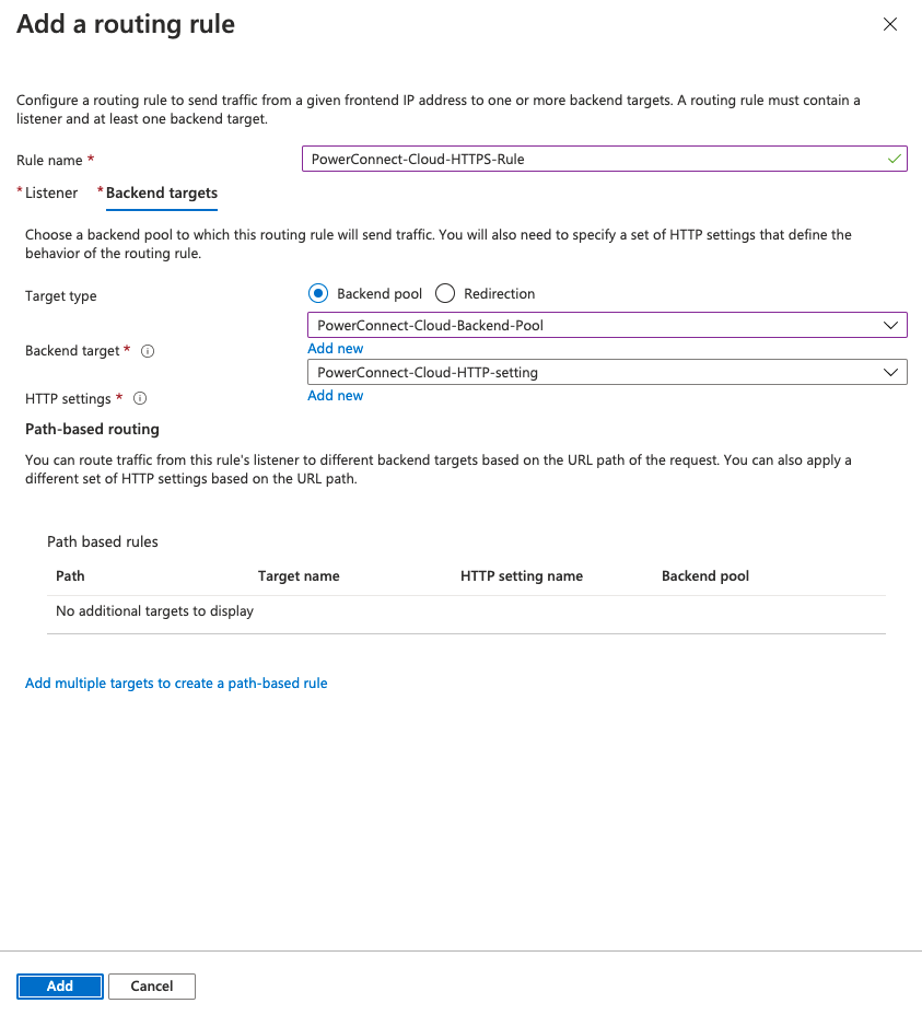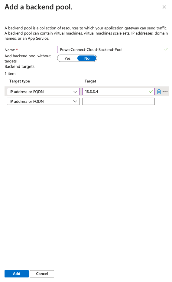 Add a new backend pool for the PowerConnect Cloud virtual machines. Add each server ip or virtual machine running PowerConnect Cloud to the targets: