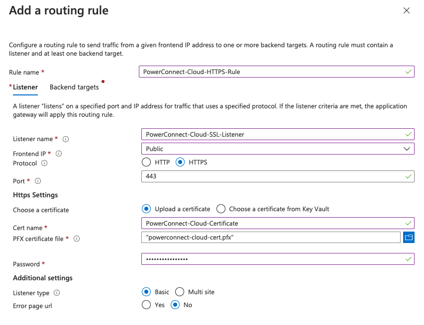Create a HTTP listener and rule for PowerConnect Cloud. Upload or choose a SSL certificate from the Key Vault: