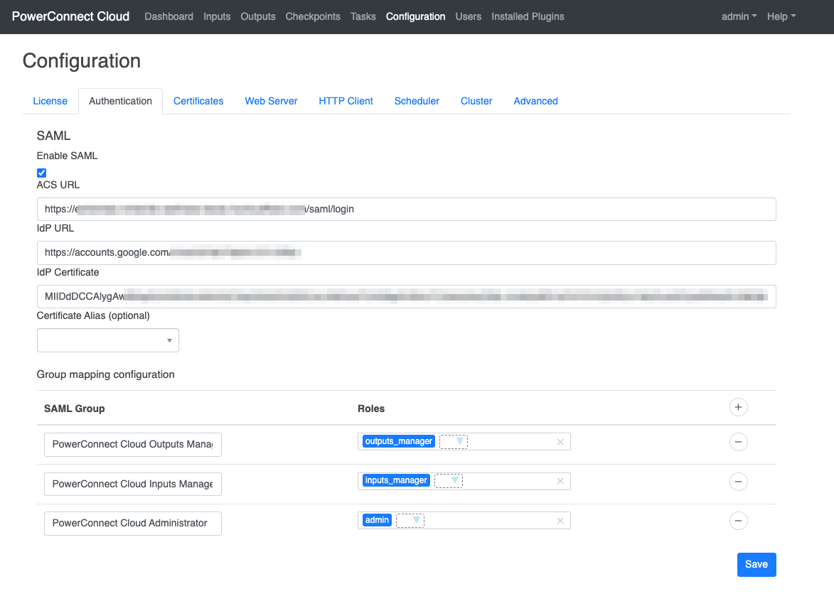 Perform the role mapping to map the PowerConnect Cloud groups you created in your SAML provider to the local groups that exist in the PowerConnect Cloud software