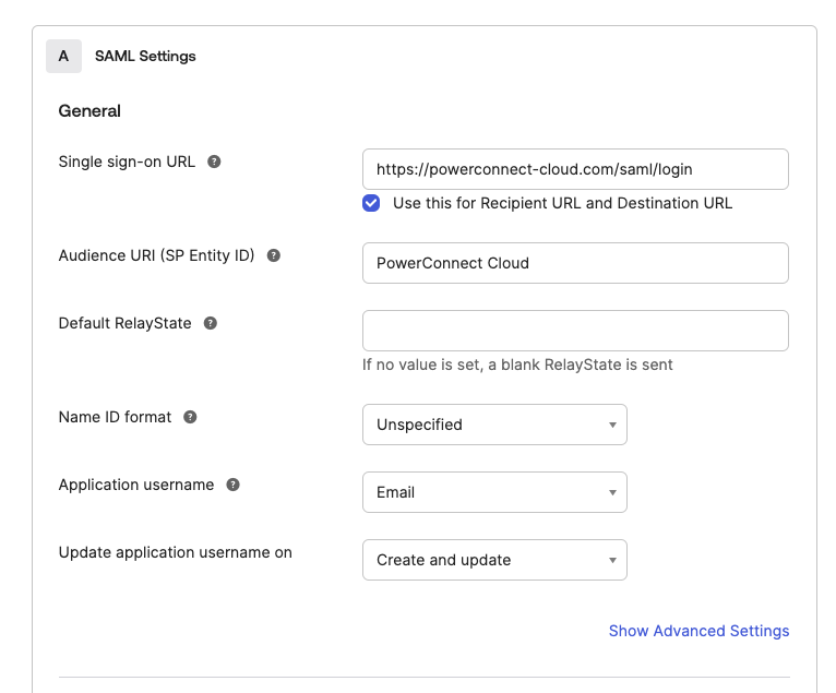 Single sign-on url - this should be the url of the PowerConnect Cloud UI with /saml/login appended to it