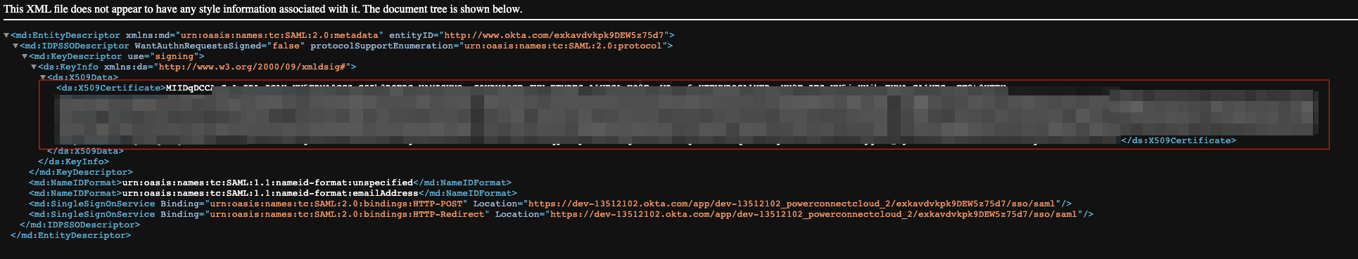 Copy the contents of the X509Certificate xml element - this will be used in the certificate setting in the PowerConnect Cloud UI