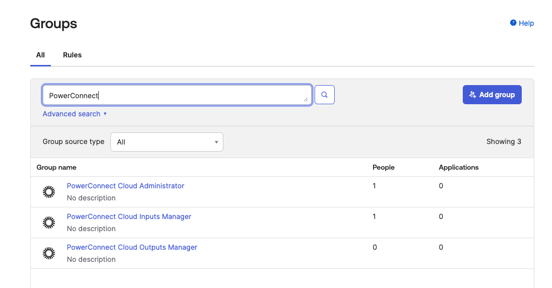 Click Add Group and create a group for each of the PowerConnect Cloud roles - Administrator, Inputs Manager and Outputs Manager