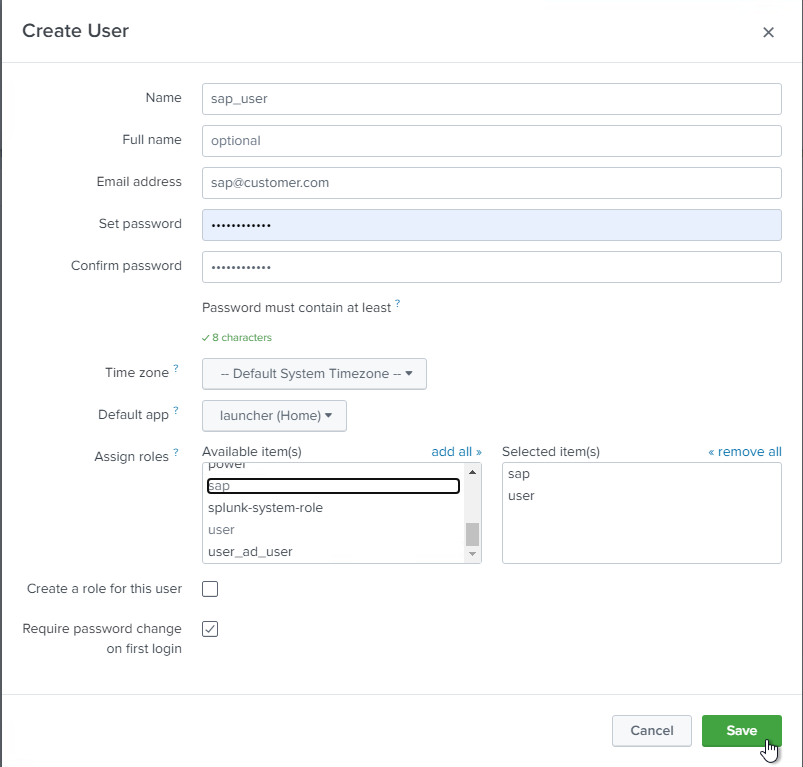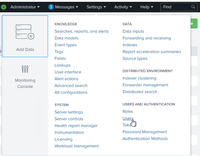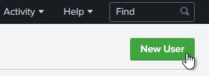 In Splunk settings please select “Users” and create a new user by clicking o the corresponding button.
