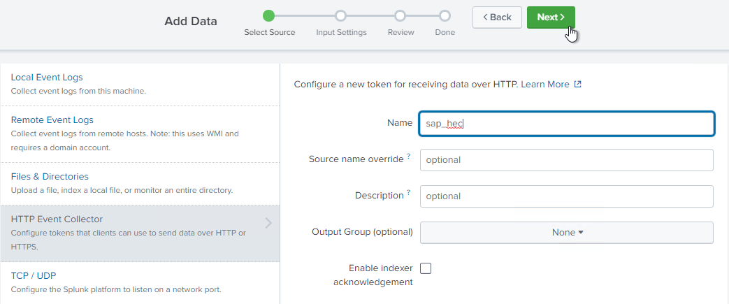 For establishing a connection between the SAP system and Splunk an HTTP Event Collector (HEC) must be created within Splunk. In order to create the HEC…