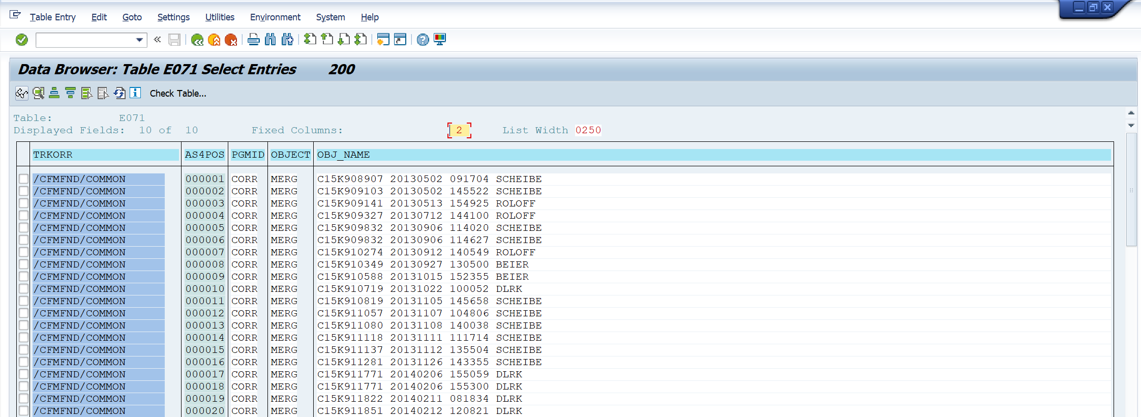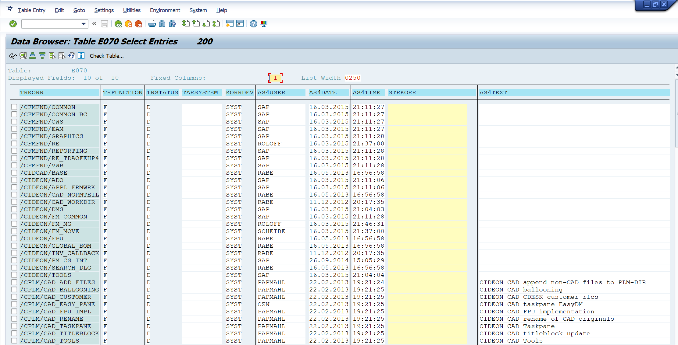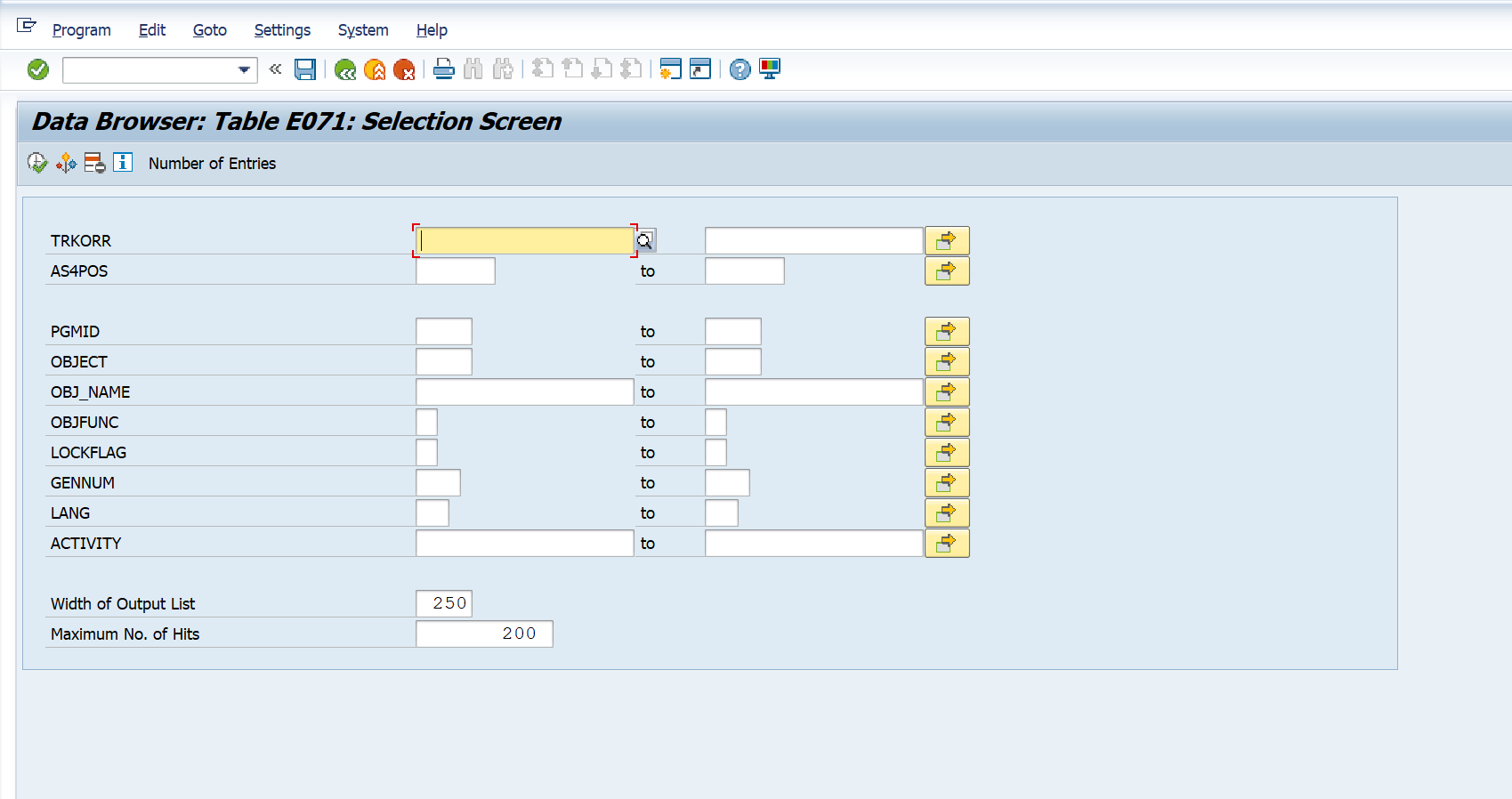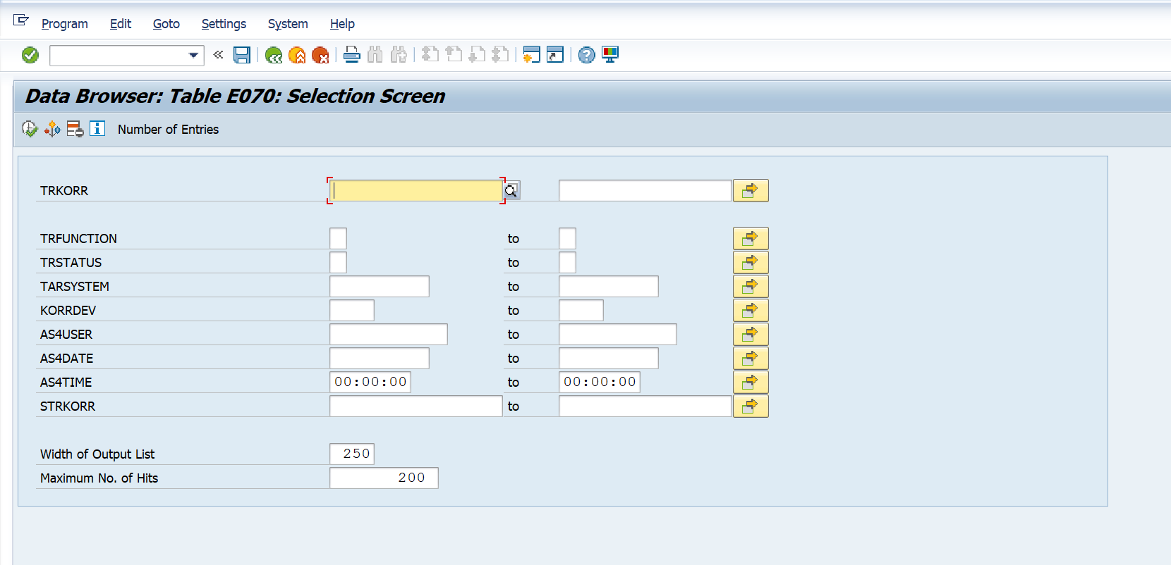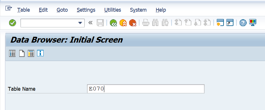 Note: Note that the data is being extracted from the E070, E07T,and the E070M tables. Documented below is how to navigate to the tables in SAP using E070 as an example.