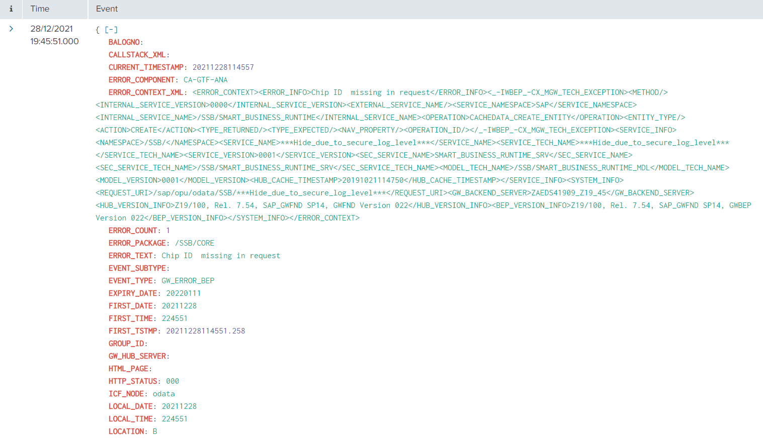 For Event Type GW_ERROR_FND the above fields in the Error Context section are optional and if activated (using configuration) then are sent to the Splunk system (in XML string).