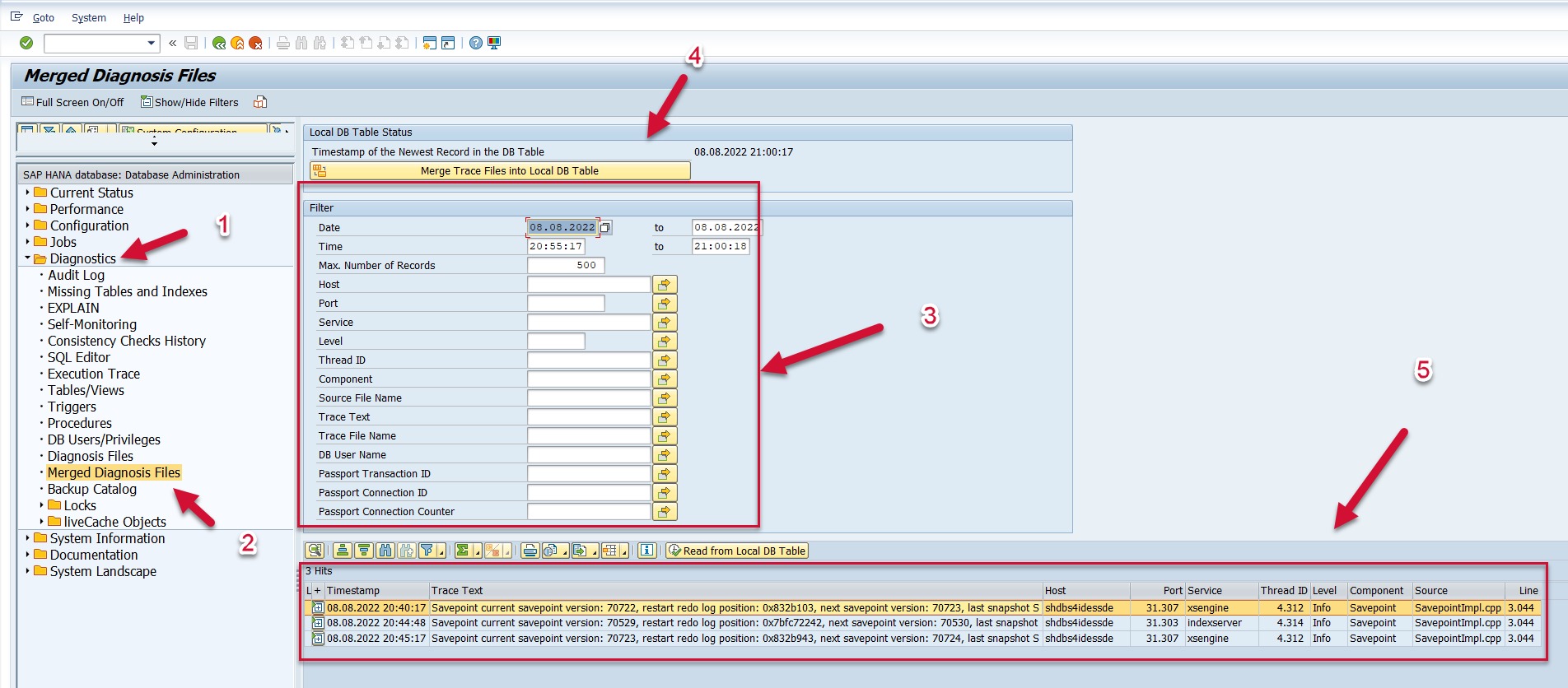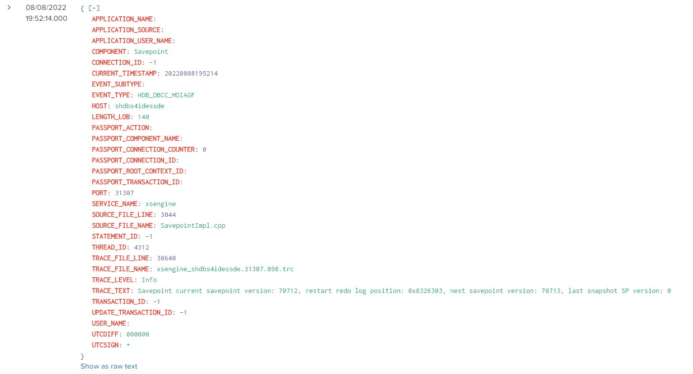 Execute the dbacockpit transaction in the system. Open the Diagnostics folder and double-click on “Merged Diagnosis Files”. Enter the desired user selection criteria in the top of the screen, and then click on the Merge Trace Files into Local DB. Double-click the Merged The information displayed on the right side of the screen will match the data that is extracted and sent to Splunk.