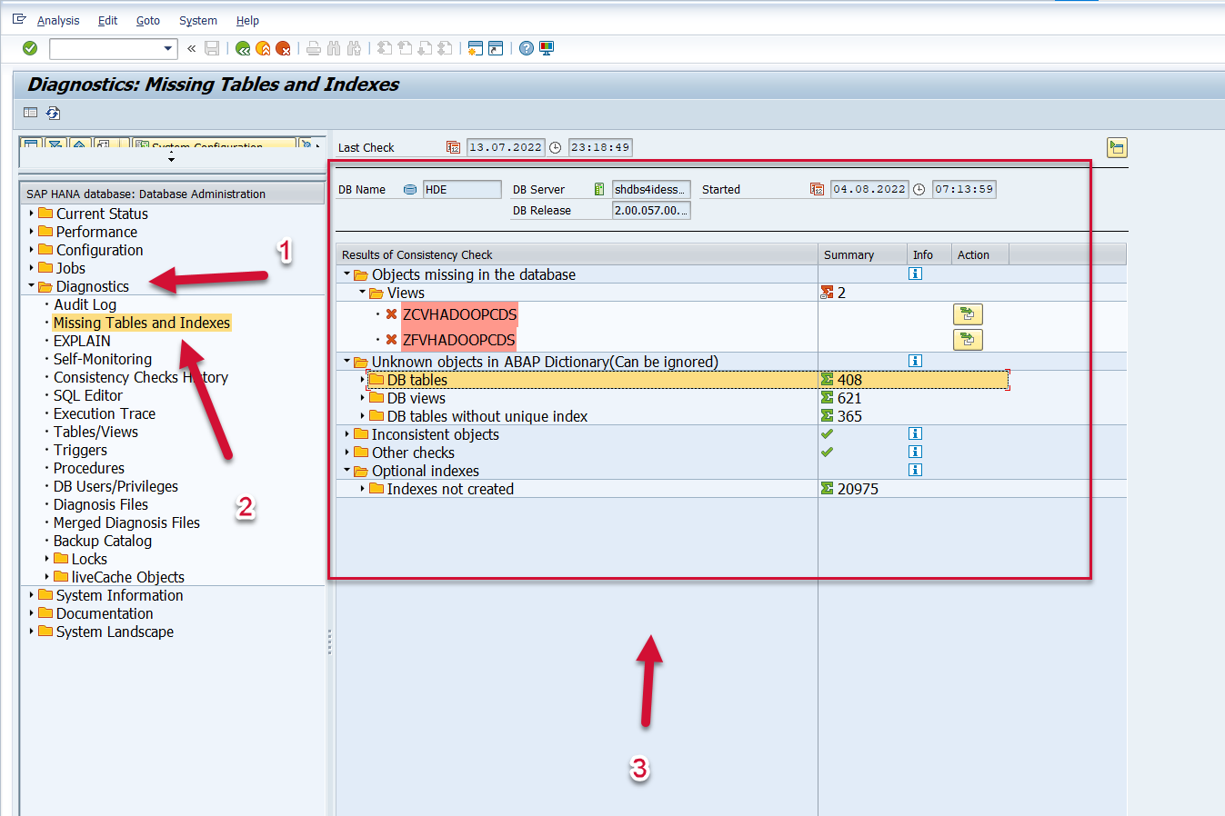 Execute the dbacockpit transaction in the system. Open the Diagnostics folder and double-click on “Missing Tables and Indexes”. The information displayed on the right side of the screen will match the data that is extracted and sent to Splunk.