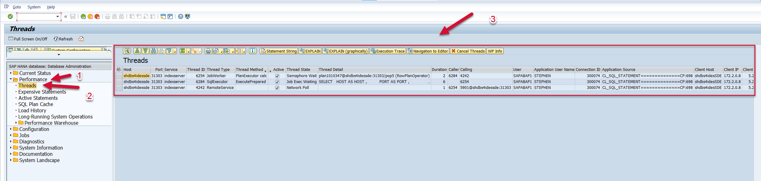 Execute the dbacockpit transaction in the system. Open the Performance folder and double-click on “Threads”. The data displayed on the right side of the screen will match the data that is extracted and sent to Splunk.