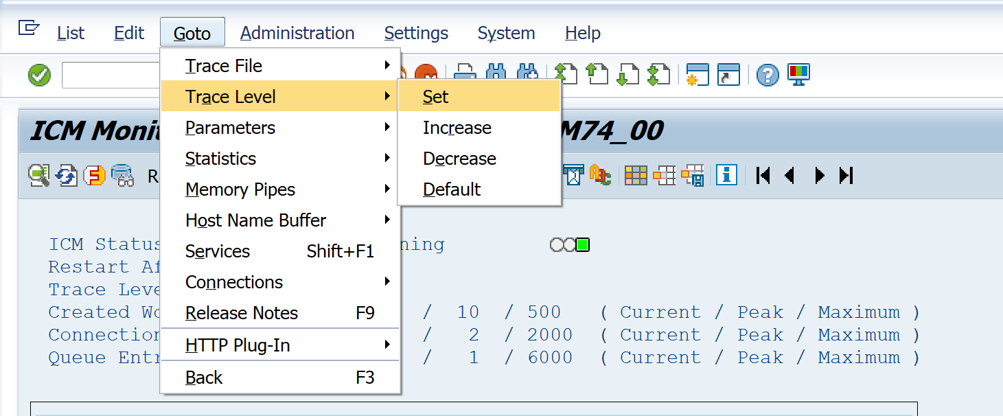Log into the system and client where the PowerConnect agent is installed and execute the SMICM transaction. Click on Go To → Trace Level → Set.