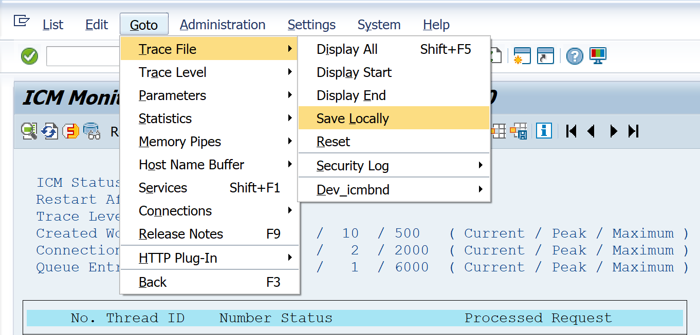 Return to the initial page of the SMICM transaction. Click on Go To → Trace File → Save Locally.