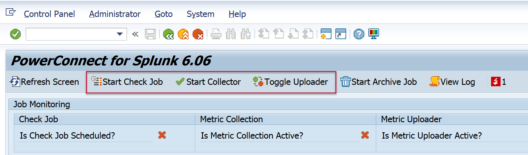 Log into the system where the PowerConnect application is installed. Execute the /n/bnwvs/main transaction, and click on the buttons below to stop the PowerConnect batch jobs