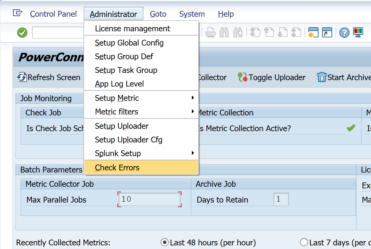 • Log into the client where the PowerConnect application is installed, and execute the /n/bnwvs/main transaction. Then go to Administrator → Check Errors.