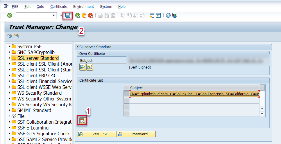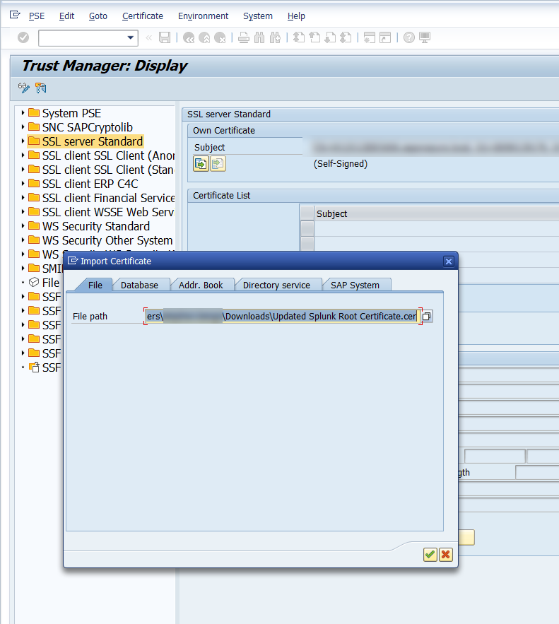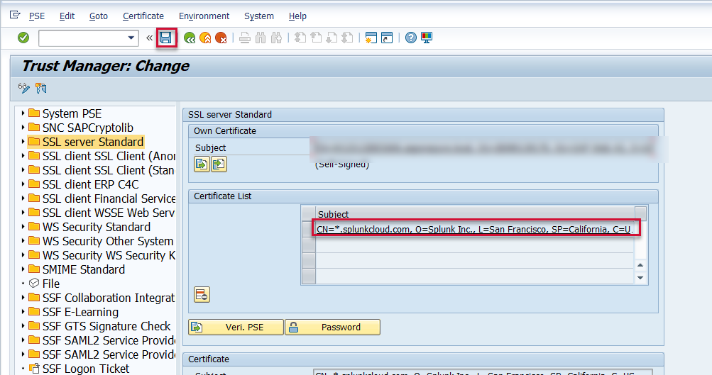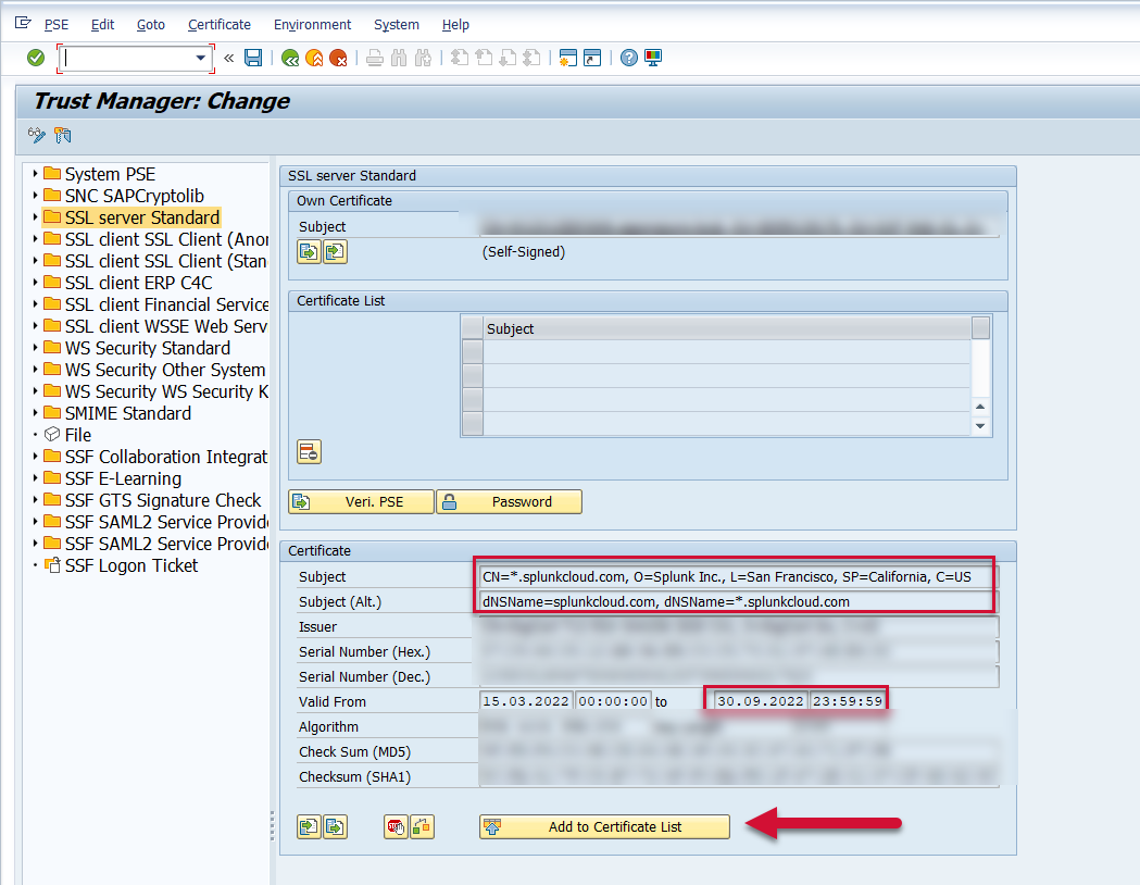 SSL certificates expire on a periodic basis. The validity of the SSL certificate used to establish a secure connection between SAP and Splunk can be viewed via the STRUST transaction. Since the SSL certificates expire on a periodic basis, they need to be updated periodically. Obtain a new SSL certificate from your Splunk Administrator using the following document: Configure SSL in Splunk (Recommended) . Once the updated certificate is obtained, update the SSL certificate in the SAP system please follow the steps below: