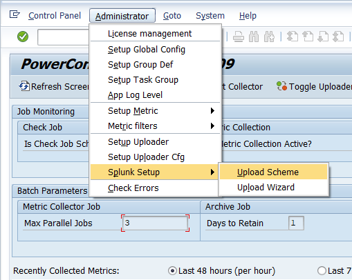 Then return to the PowerConnect administrative console using the /n/bnwvs/main transaction and go to Administrator → Splunk Setup → Upload Scheme