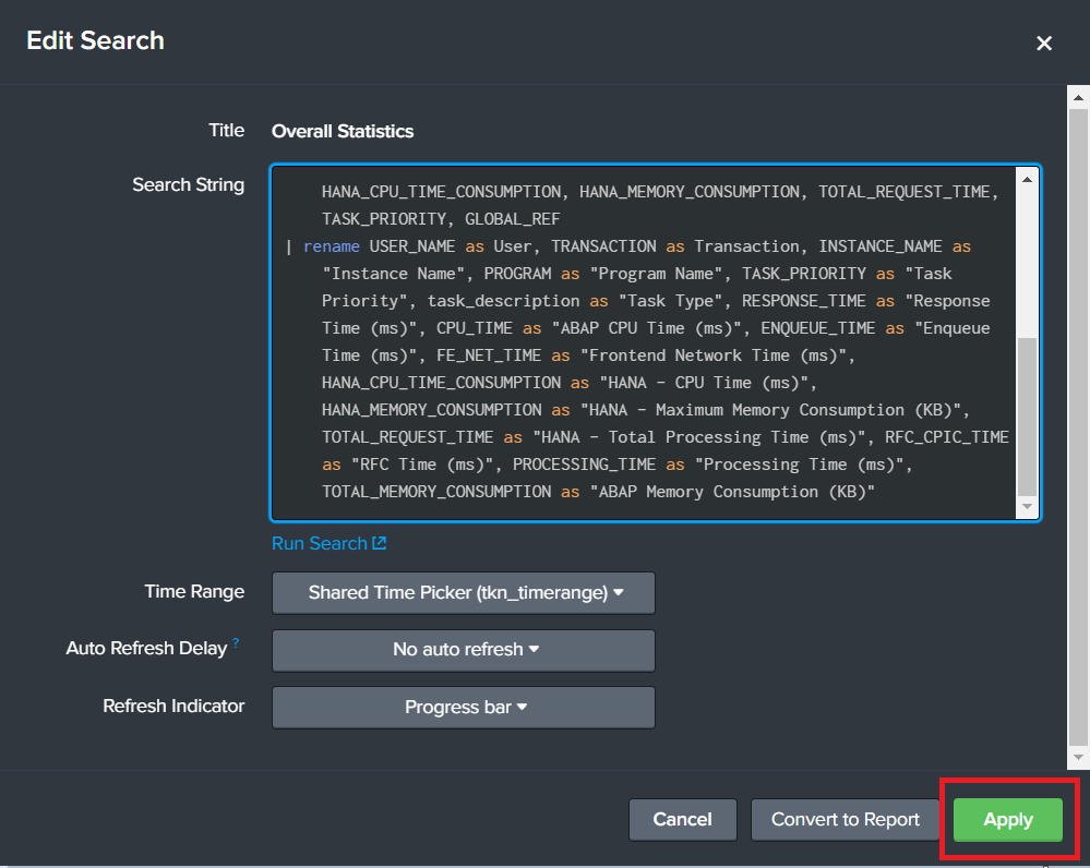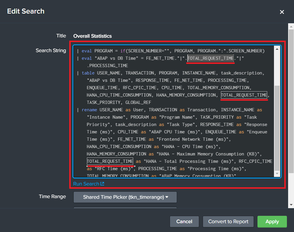 Replace all references in the search string to the HANA_PROCESSING_TIME field with TOTAL_REQUEST_TIME.