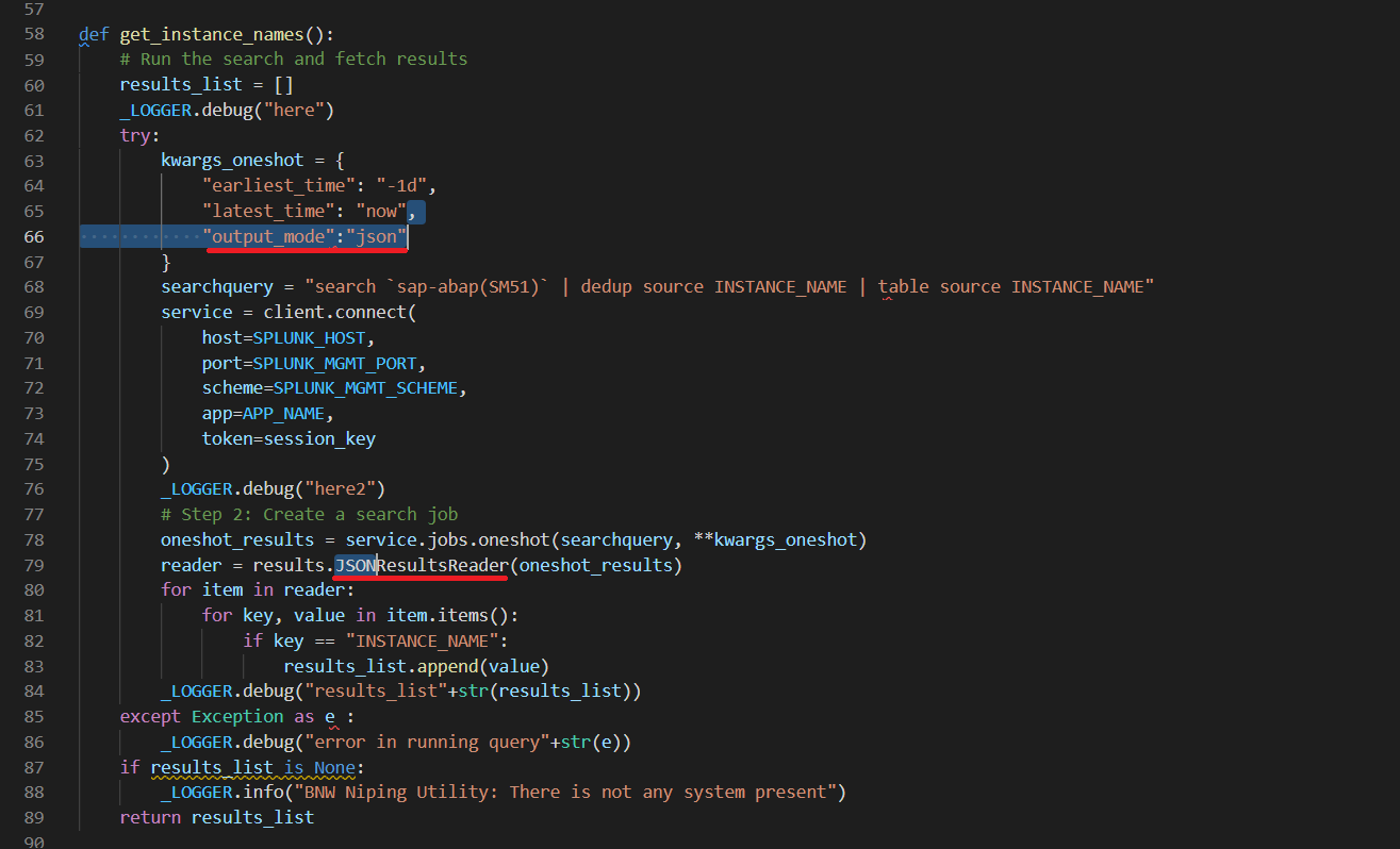 Change the function ResultsReader to JSONResultsReader and add the key-value pair “output_mode”: “json” in the kwargs_oneshot object inside the get_instance_names function.