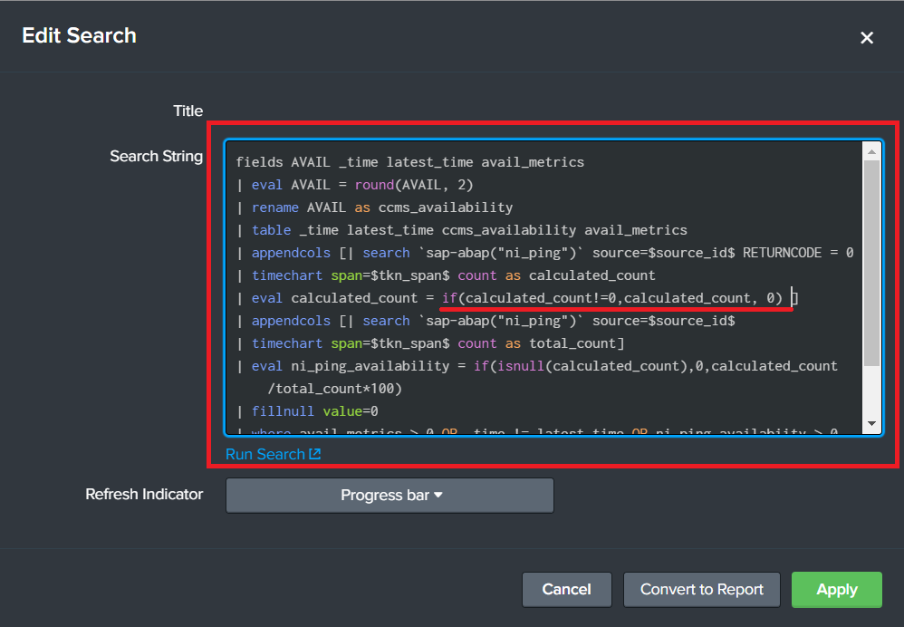Replace the existing value of “110” with “if(calculated_count!=0,calculated_count, 0)” on the eval line for the calculated_count field.
