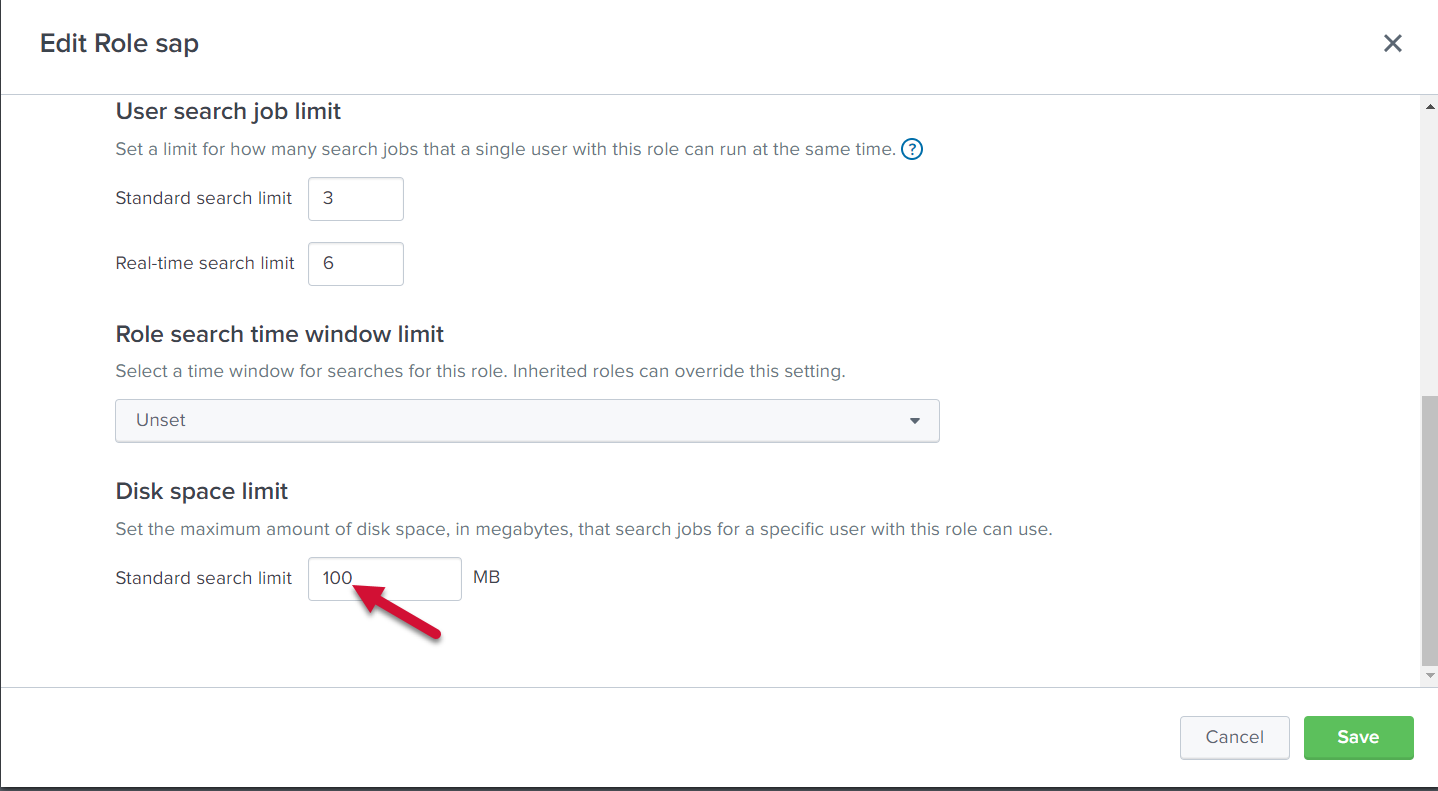 Important Warning! Any modifications to the disk quota and concurrent search limits assigned to roles could have significant negative performance impacts to your Splunk environment. Any changes to these limits should be first reviewed by the Splunk team responsible for your Splunk environment, since they are the only individuals capable of assessing impact on performance.