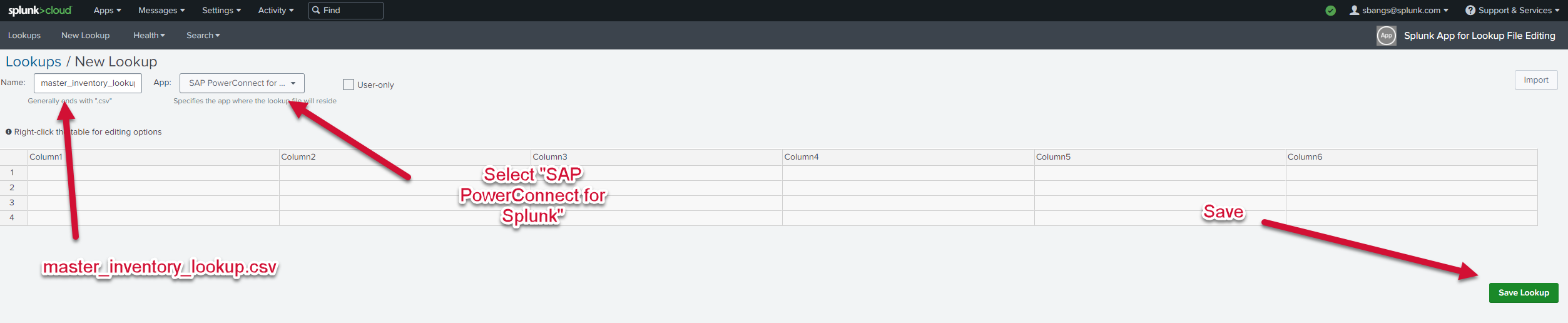 Create a new CSV lookup called master_inventory_lookup.csv in the Splunk App for Lookup File Editing. Ensure that it is blank and associate it with the SAP PowerConnect for Splunk application as indicated in the screenshots below.