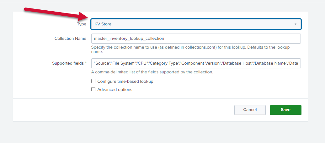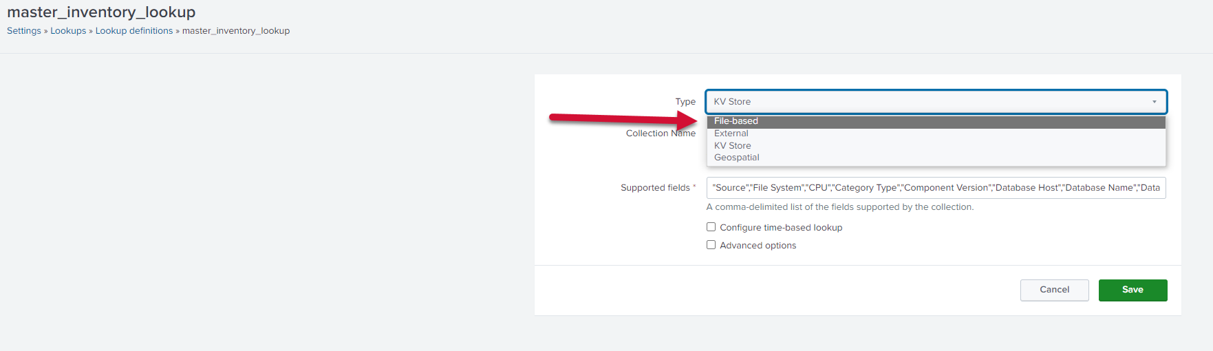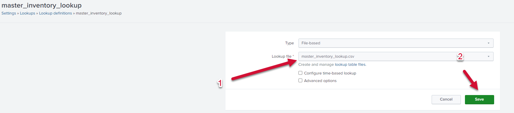 In the Lookup file, set the value to master_inventory_lookup.csv. Save the lookup definition.