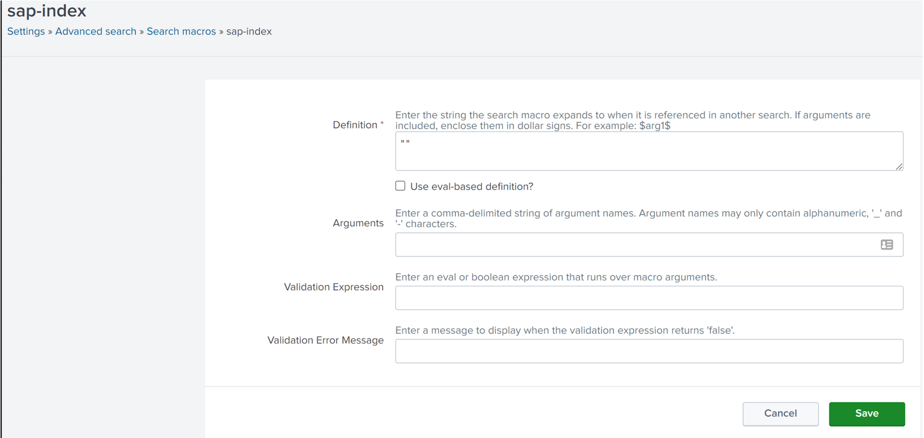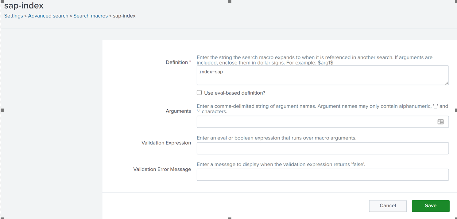 On Splunk's menu bar, Click on Search -> Advanced search -> Search Macros -> search term (sap-index)