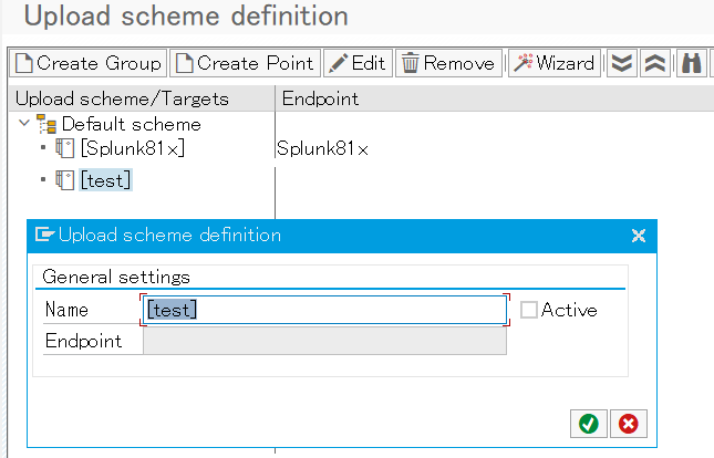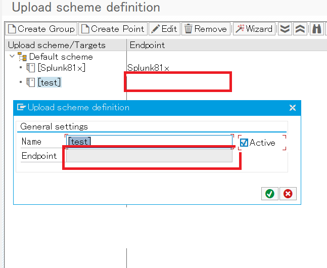 Application logs within /BNWVS/ object are growing significantly and no data is uploaded to the configured endpoint. Upload schema (Administrator->Splunk setup->Upload scheme) contains empty Endpoint name in the Target definition (left side of the screen). The invalid Target is active: