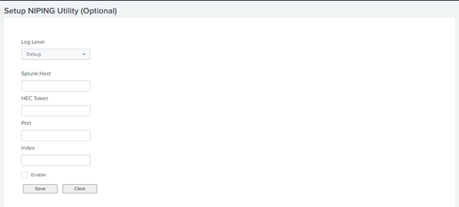 The NIPING setup page is used to configure the NIPING utility in the SAP PowerConnect App for Splunk and consists of the following fields: