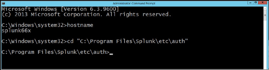Logon through RDP to the Splunk server and start a DOS command window. Change directory to the $SPLUNK_HOME\etc\auth directory of the Splunk installation.