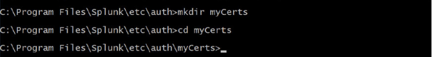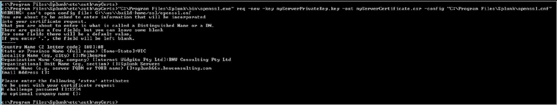 “C:\Program Files\Splunk\bin\openssl.exe” req -new -key myServerPrivateKey.key -out myServerCertificate.csr -config “C:\Program Files\Splunk\openssl.cnf”