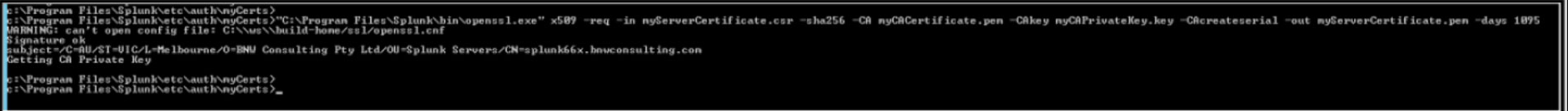 “C:\Program Files\Splunk\bin\openssl.exe” x509 -req -in myServerCertificate.csr -sha256 -CA myCACertificate.pem -CAkey myCAPrivateKey.key-CAcreateserial -out myServerCertificate.pem -days 1095
