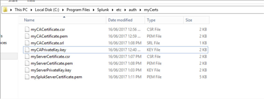 “C:\Program Files\Splunk\bin\openssl.exe” req -new -key myCAPrivateKey.key -out myCACertificate.csr -config “C:\Program Files\Splunk\openssl.cnf