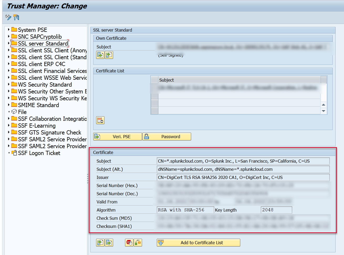 Note: The certificate shown below is if the customer has an Splunk Cloud environment. The same concept applies for Splunk Enterprise. The CN name should match the Splunk endpoint of where you are sending the SAP data.