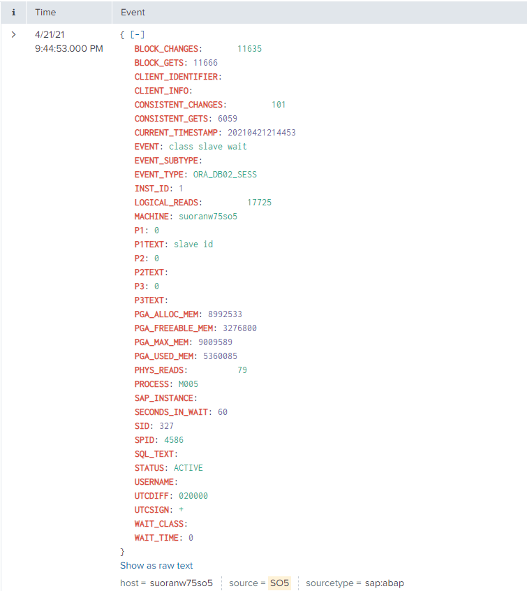 Log into the managed system and execute the dbacockpit transaction code. Then expand the Performance menu option on the left side of the screen, and then expand the Wait Event Analysis menu option. Double-click the Session Monitor option. The data displayed will match the data that is extracted and sent to Splunk.