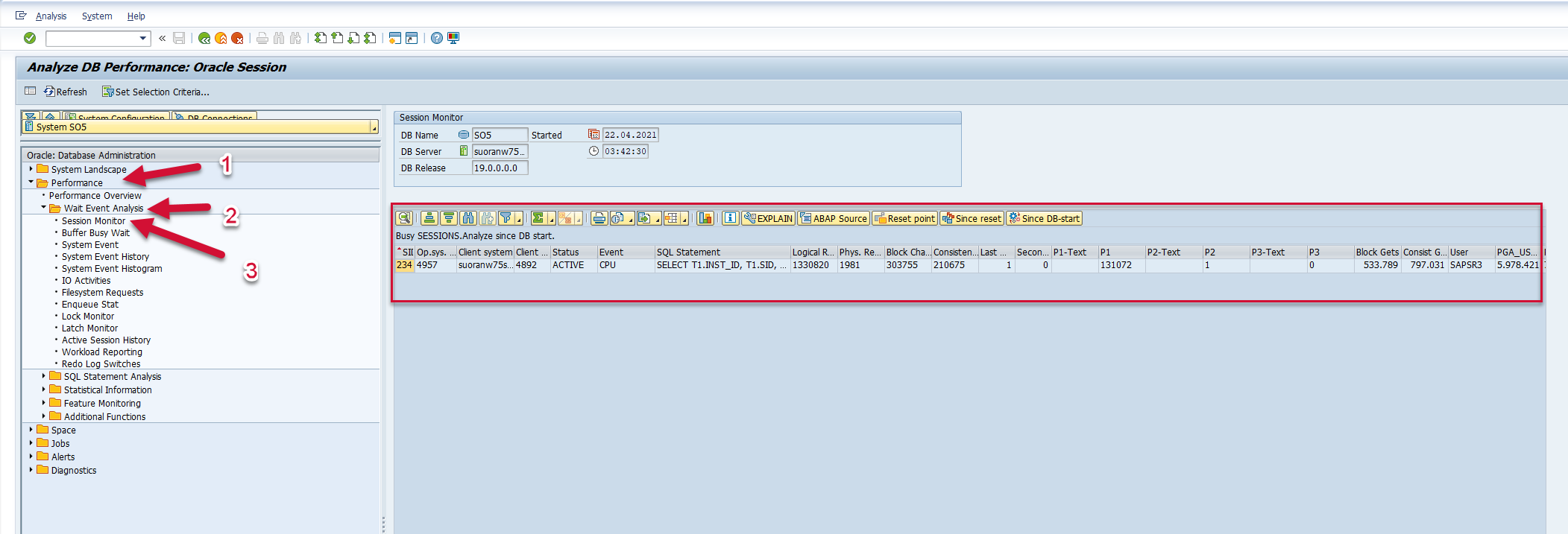 The ORA_DB02_SESS event is used in SAP to check the Oracle session list and related resource information. In addition, you can see an execution plan and the SQL statement performed by a session. If a session performs an SQL statement from an ABAP program you can display the ABAP source.