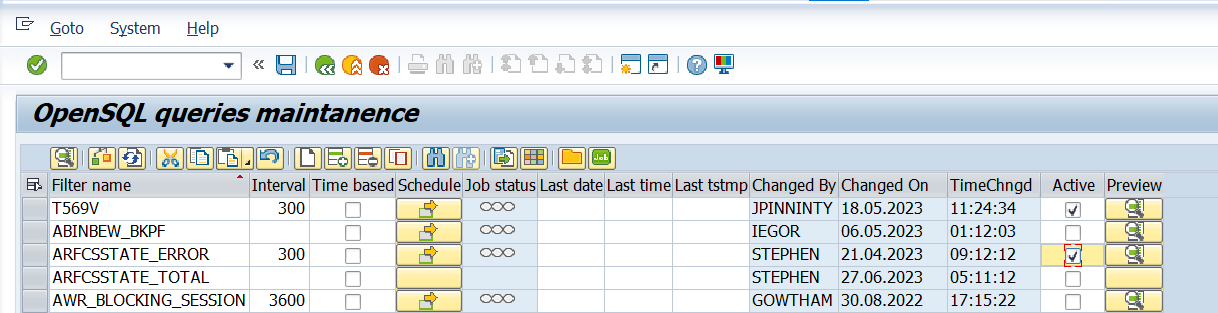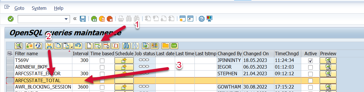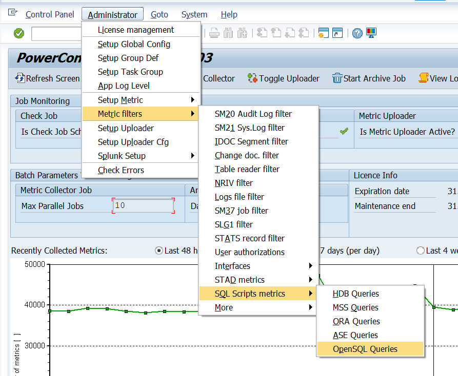 Execute the /n/bnwvs/main transaction in the client where the PowerConnect application is installed. Go to Administrator → Metric Filters → SQL Script Metrics → OpenSQL Queries.